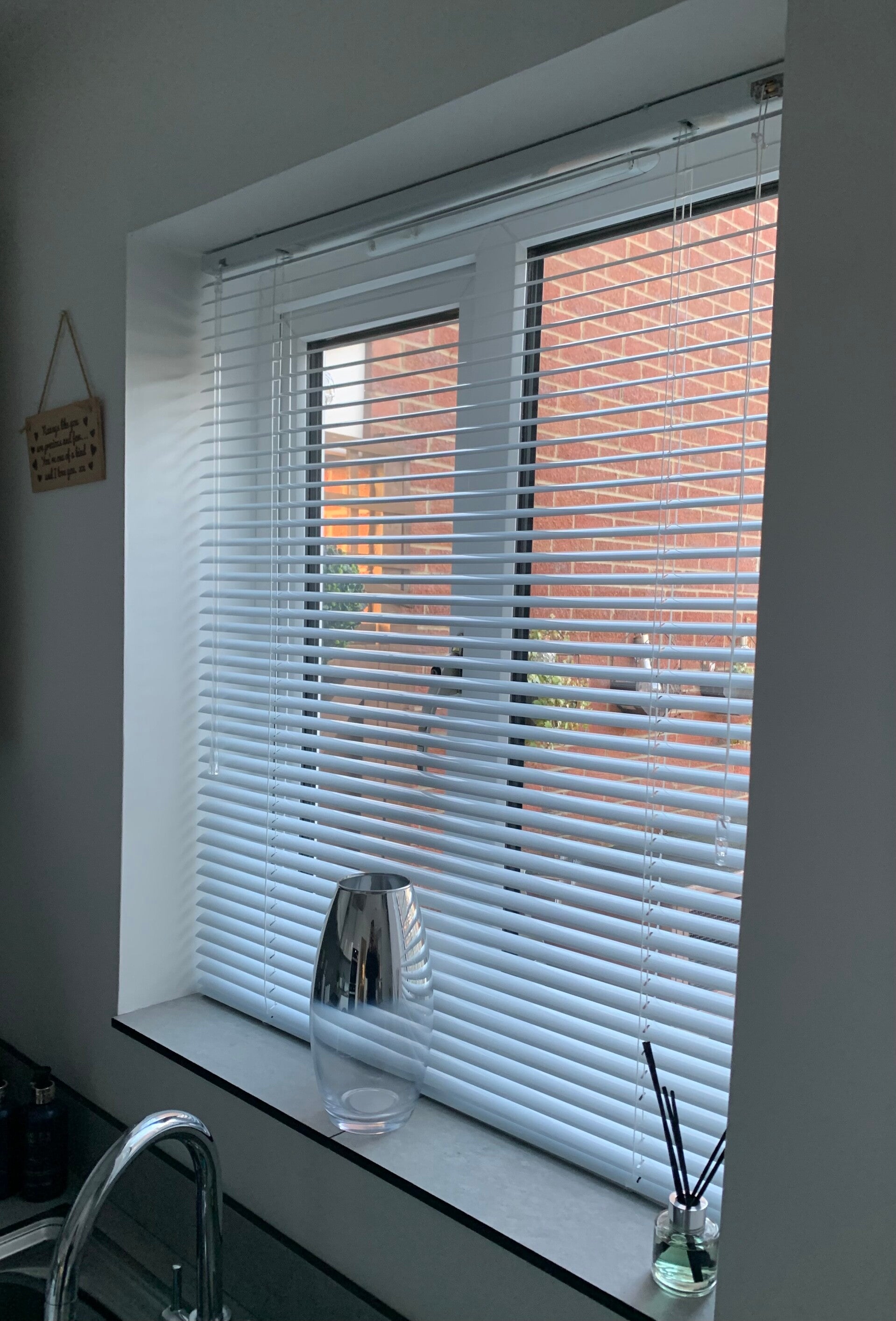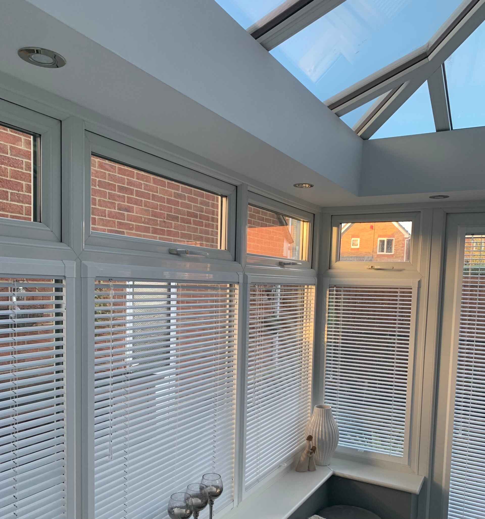 Our latest install we used Perfect Fit Aluminum Blinds in the conservatory and standard aluminum blinds in the kitchen window recess. This gave a modern sleek look the job was topped off with wooden venician blinds in the living room. Very happy customer.